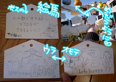 新年イベントのひとつがひっそりとやっていたのでみんなで絵馬かいてきたんですが(下のが自分の)、小十郎をプレイキャラに!とかそれぞれ本気のお願い(笑)もしかしたら…!カプ●ン様の目にとまるかも!!とか言ってヨリヨリを駆使して超目立つ様に結びつけてきた。……凄い迷惑だったな…プリクラの前で語尾「~ずら」にしたり(大河)……公害だった…