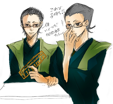 黒髪オールバック・短眉・釣り目・メガネ・実は着物がファンシートーンなルックス・